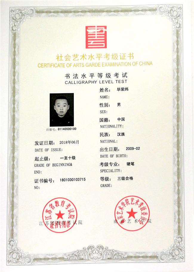 毕荣炜获江苏省硬笔书法三级