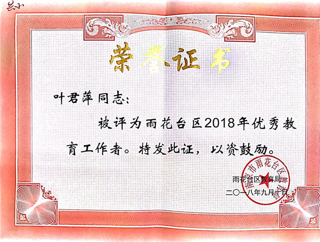 叶君萍被评为雨花台区2018年优秀教育工作者