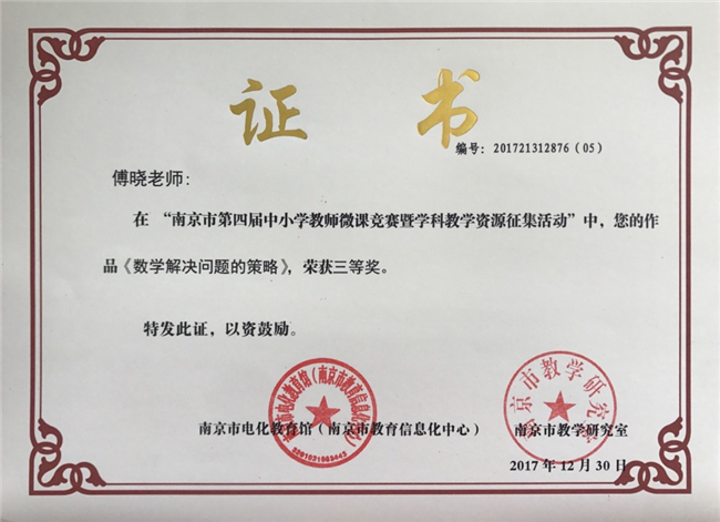 傅晓的作品《数学解决问题的策略》荣获南京市三等奖