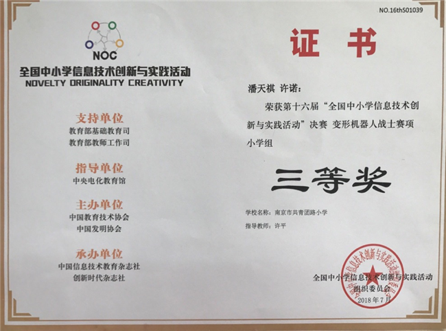 潘天祺、许诺荣获第十六届“全国中小学信息技术创新与实践活动”决赛变形机器人战士赛项小学组三等奖
