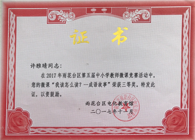 许雅晴的微课“我该怎么读?--成语故事”荣获区三等奖