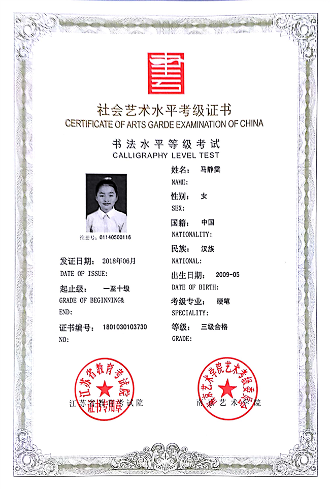 马静雯获江苏省硬笔书法三级