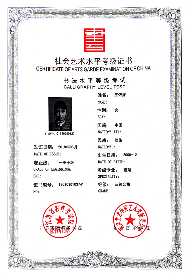王依濛获江苏省硬笔书法三级
