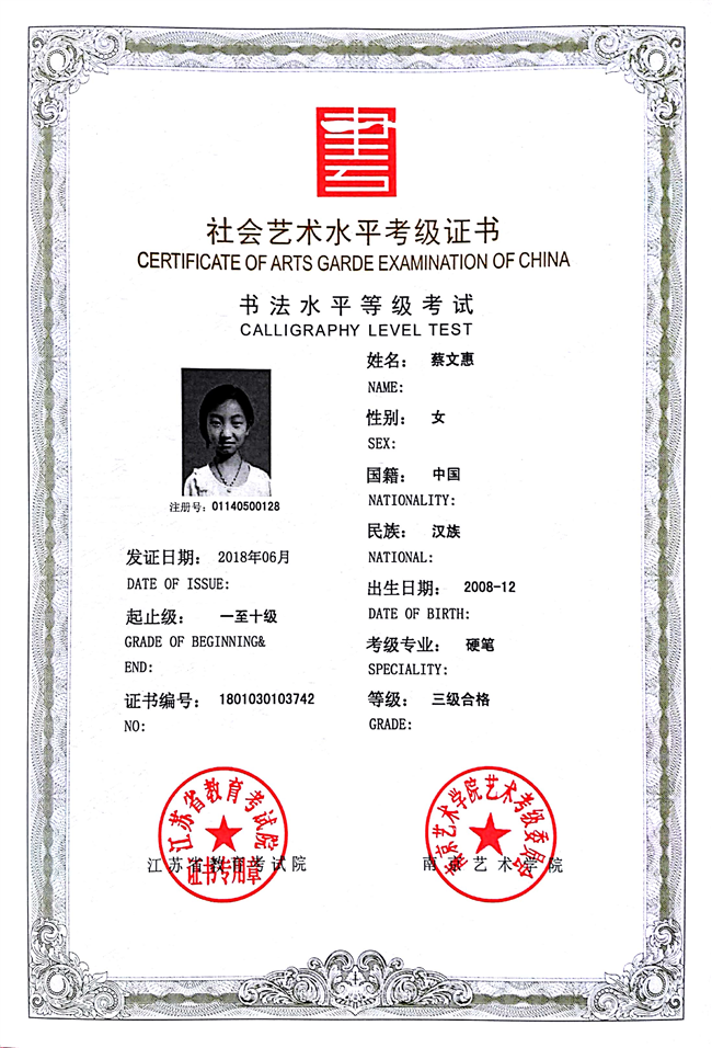 蔡文惠获江苏省硬笔书法三级