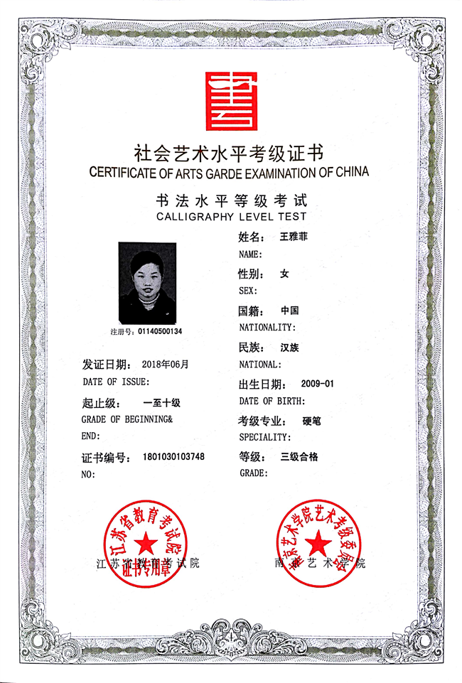 王雅菲获江苏省硬笔书法三级