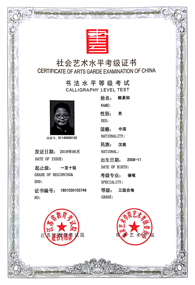 郦易知获江苏省硬笔书法三级