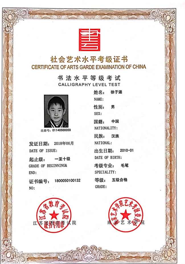 徐子涵获江苏省毛笔书法五级