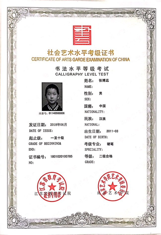 张博远获江苏省硬笔书法二级