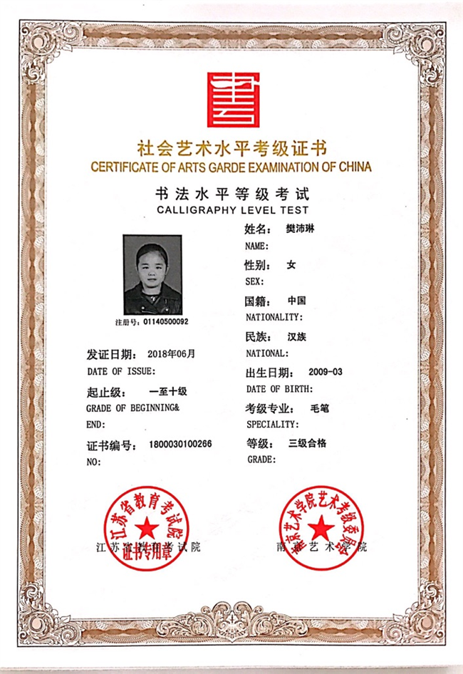 樊沛琳获江苏省毛笔书法三级