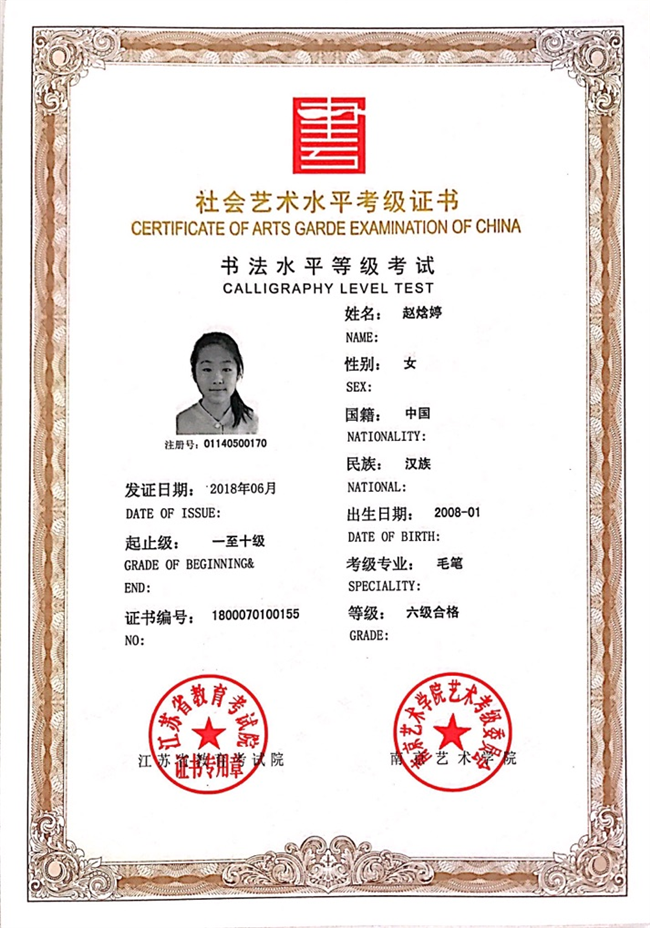 赵焓婷获江苏省毛笔书法六级