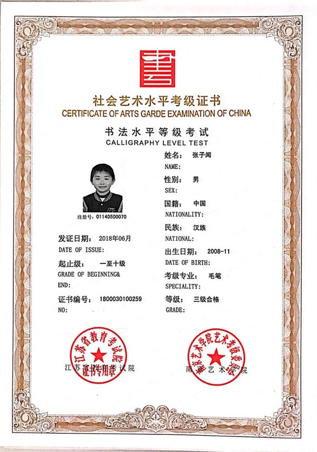 张子闻获江苏省毛笔书法三级