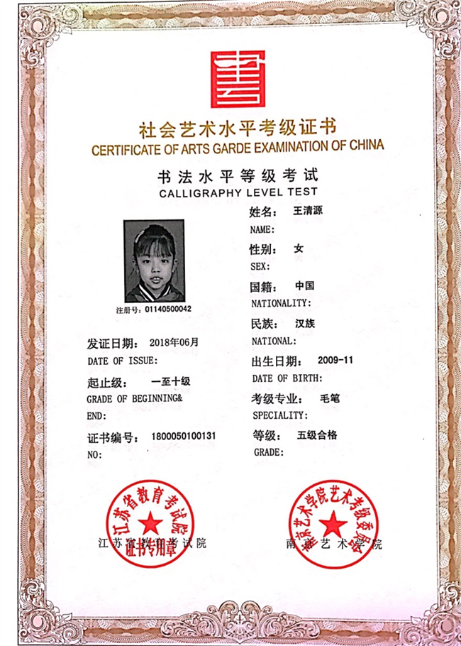王清源获江苏省毛笔书法五级