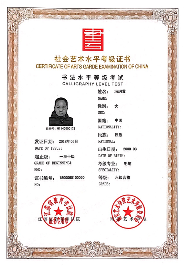 冯玥萱获江苏省毛笔书法六级