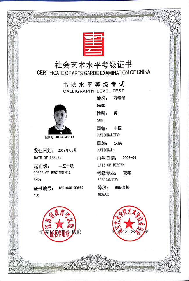 石锃铠获江苏省硬笔书法四级