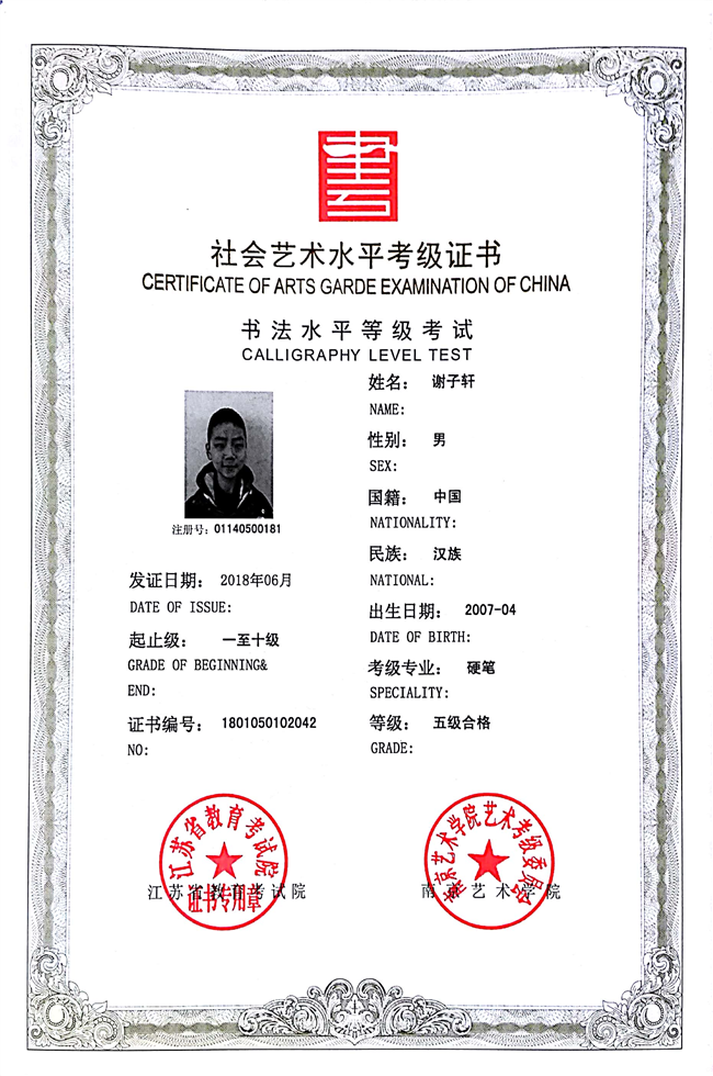 谢子轩获江苏省硬笔书法五级