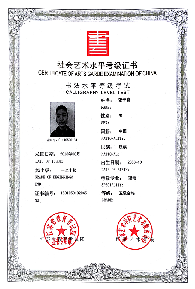 张子睿获江苏省硬笔书法五级
