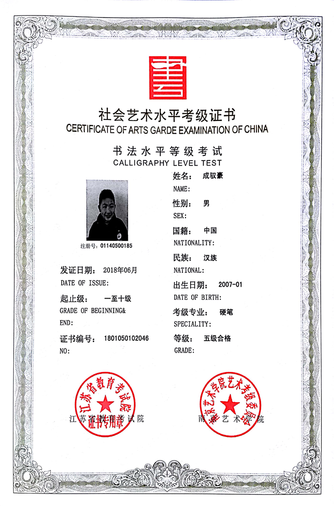 成驭豪获江苏省硬笔书法五级