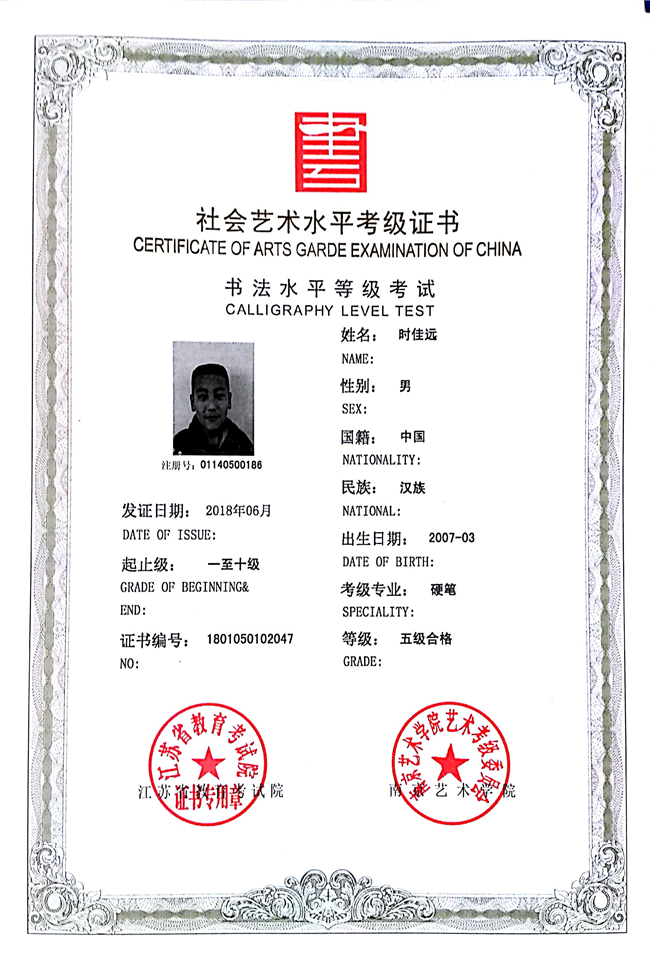 时佳远获江苏省硬笔书法五级
