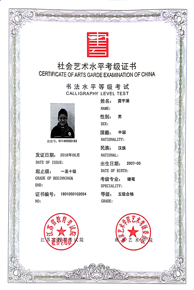 龚宇涵获江苏省硬笔书法五级