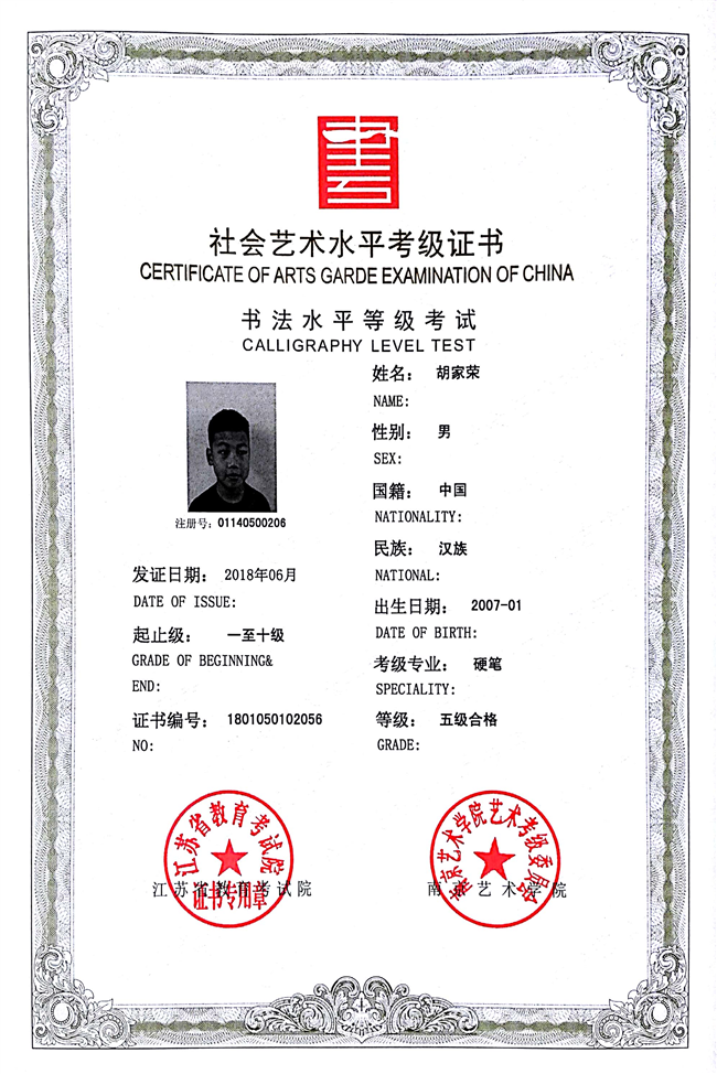 胡家荣获江苏省硬笔书法五级