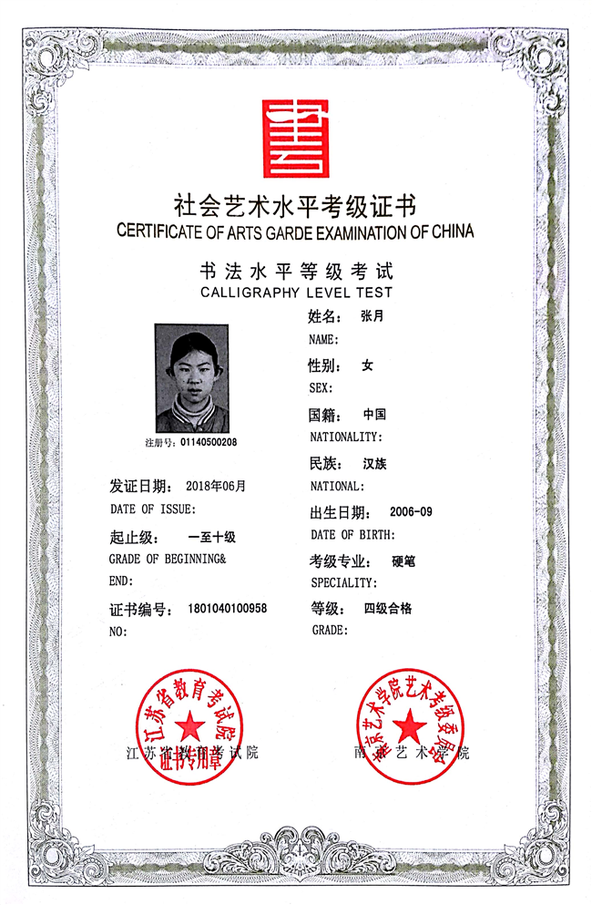 张月获江苏省硬笔书法四级