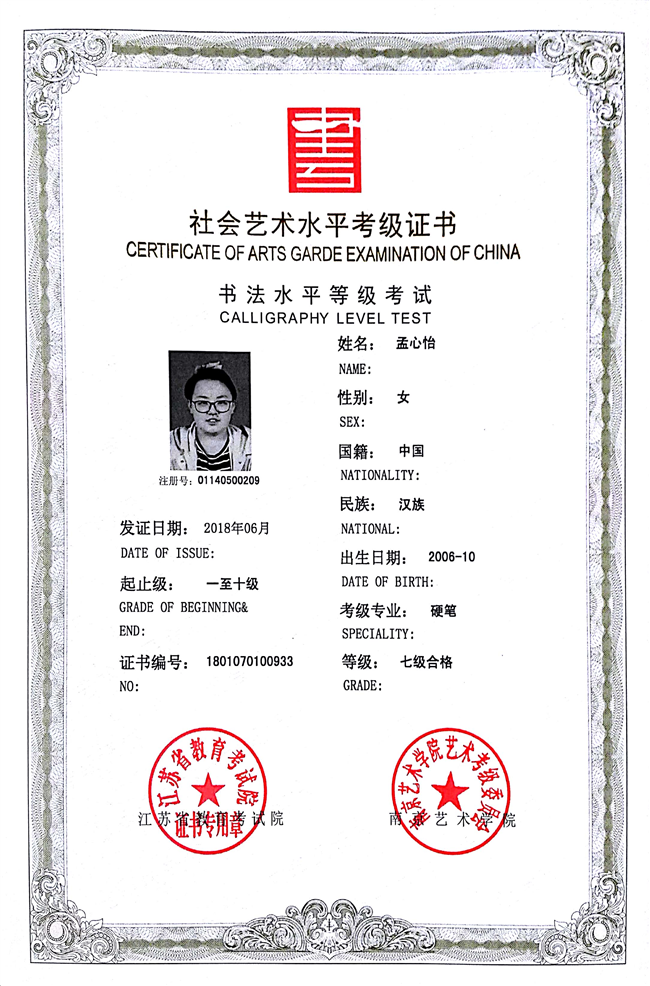 孟心怡获江苏省硬笔书法七级