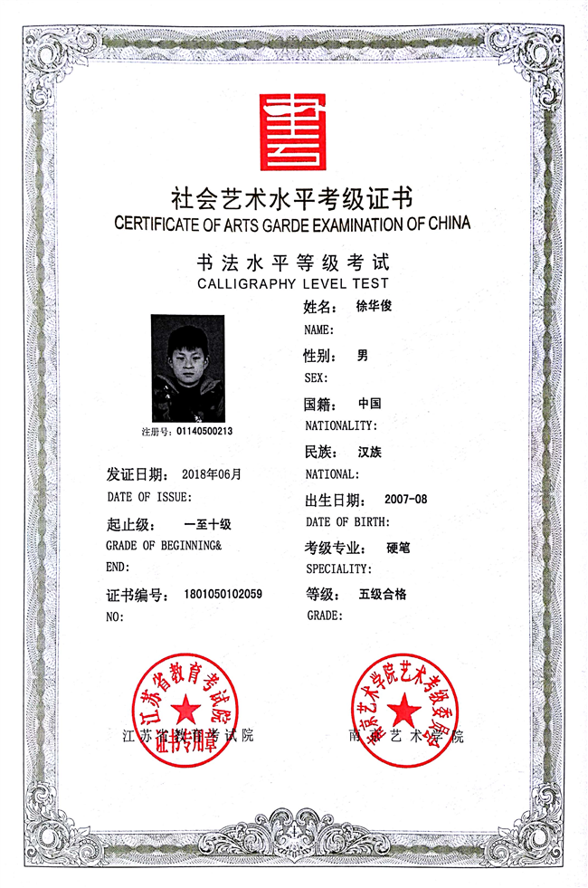 徐华俊获江苏省硬笔书法五级