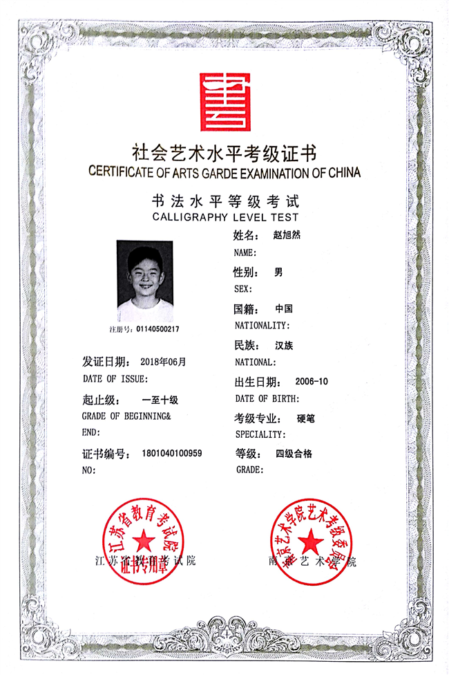 赵旭然获江苏省硬笔书法四级