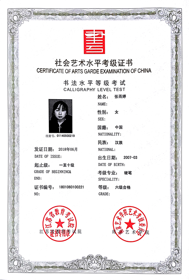 张雨婷获江苏省硬笔书法六级