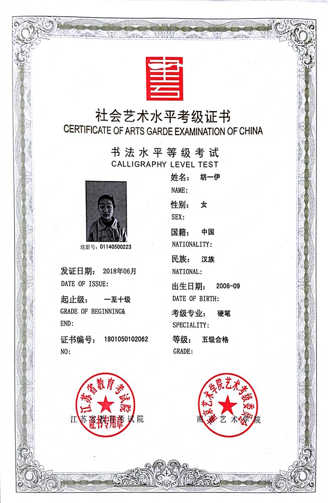 胡一伊获江苏省硬笔书法五级
