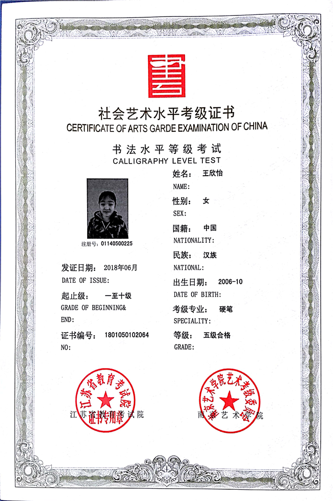王欣怡获江苏省硬笔书法五级