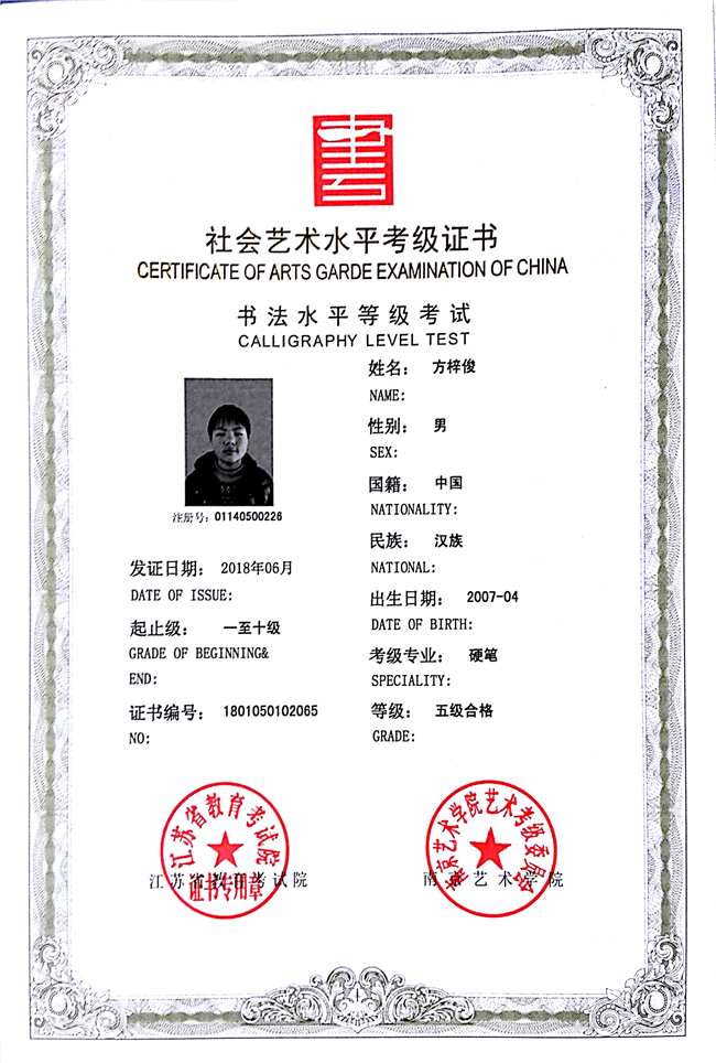 方梓俊获江苏省硬笔书法五级