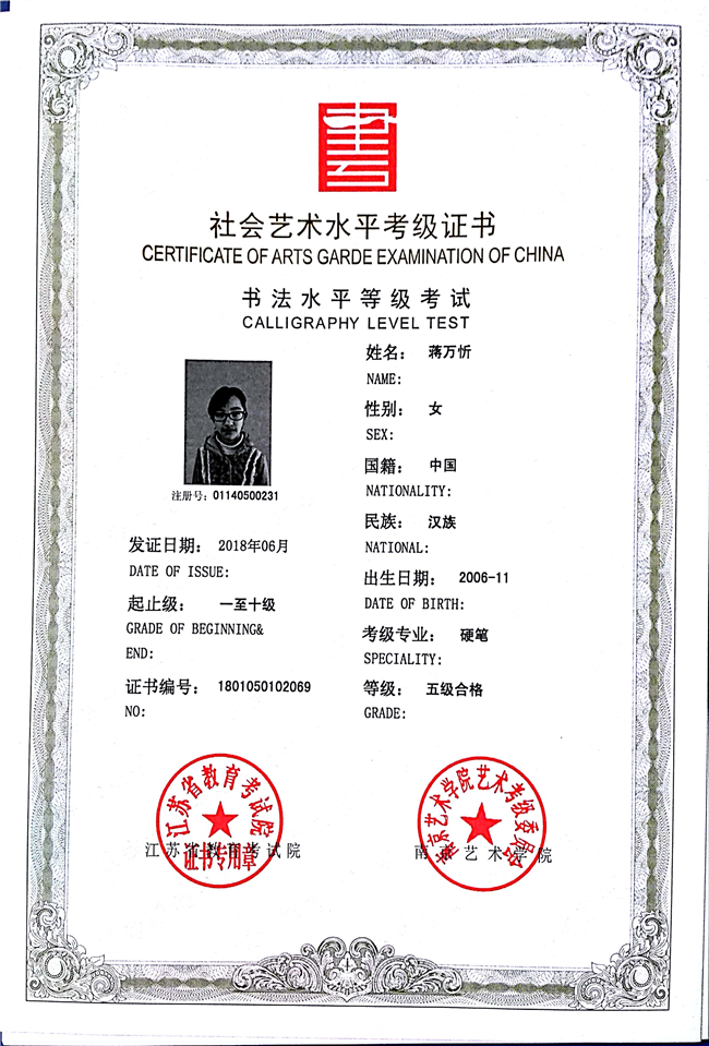 蒋万忻获江苏省硬笔书法五级
