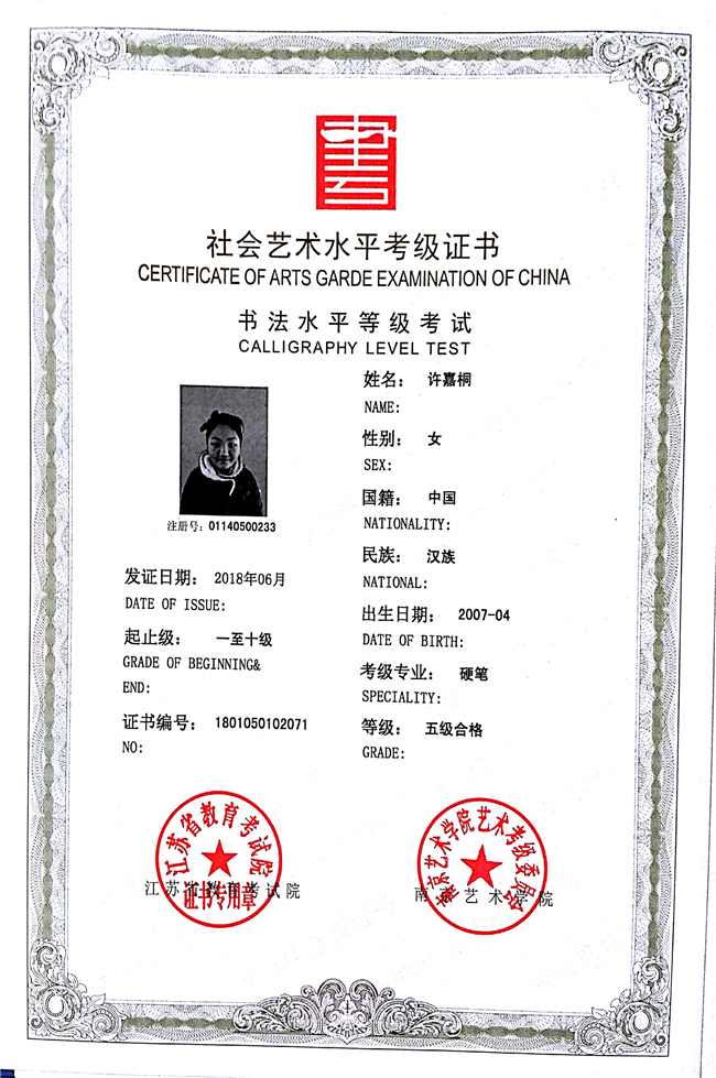 许嘉桐获江苏省硬笔书法五级