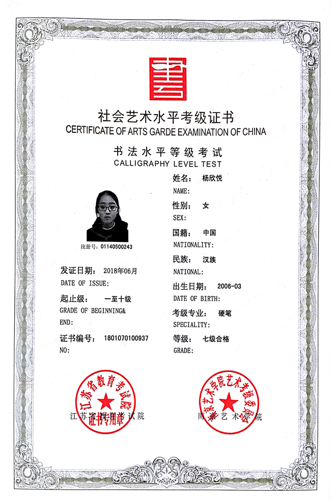 杨欣悦获江苏省硬笔书法七级