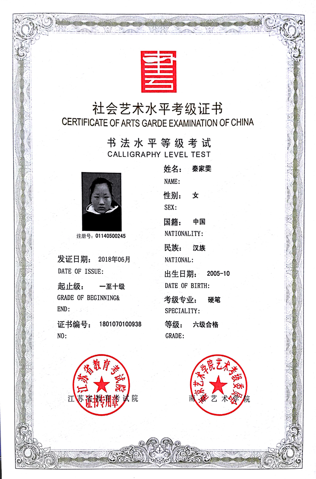 秦家雯获江苏省硬笔书法六级