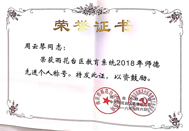 周云琴荣获雨花区教育系统2018年师德先进个人称号