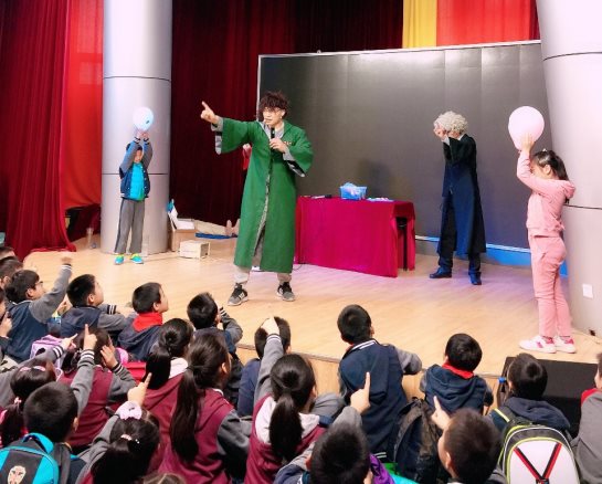 邓布利多校长和罗恩邀请台下的两位同学上台参与实验。经过一轮精彩的活动,孩子们无不赞叹:原来魔法也都是源于科学呀!