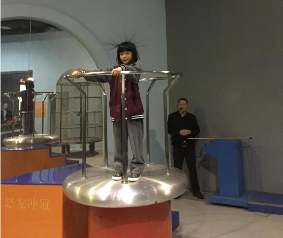 来到“怒发冲冠”厅,小女孩站在高压台上,只见讲解员叔叔操作高压开关,她的头发顿时笔直地竖了起来。真是神奇!