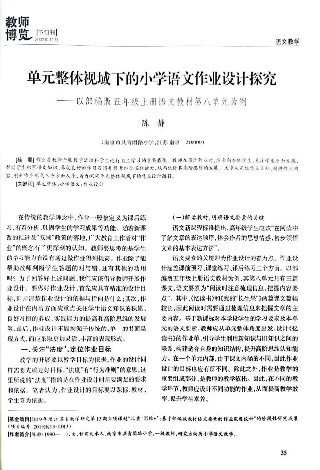 陈静老师的文章《单元整体视域下的小学语文作业设计探究》发表于《教师博览》