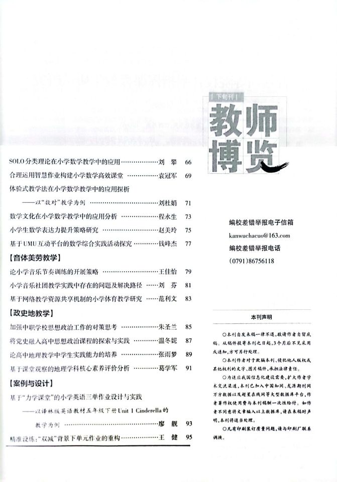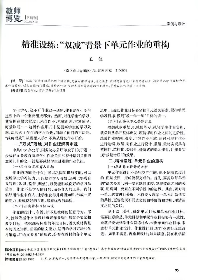 王健老师的文章《精准设练:“双减”背景下单元作业的重构》发表于《教师博览》